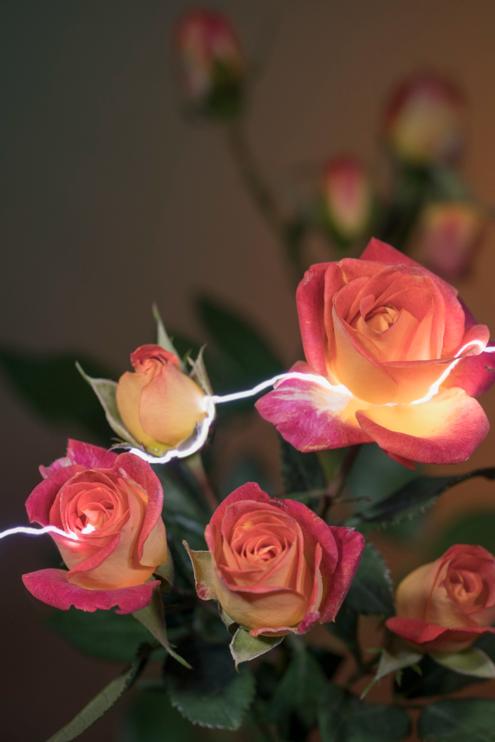 De verblindende bloemblaadjes breken door de mistige vloeistof, versterkt door twee Profoto-lampen (een soort fotografieproduct) die hun texturen en levendige kleuren versterken.