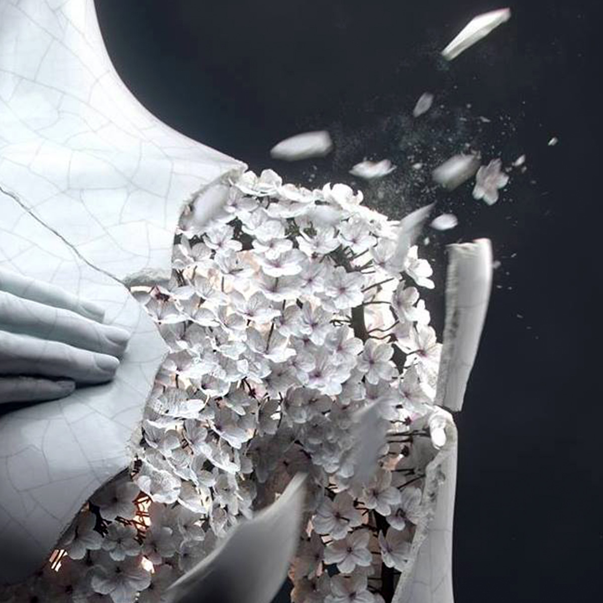 Een digitaal geboetseerd vrouwtje gemaakt van gedroogde hortensiabloesem. Een enkele bloesem is minutieus vermenigvuldigd over het raamwerk van de vrouwelijke anatomie, waardoor een surrealistische digitale sculptuur is ontstaan die de natuurlijke en de fysieke wereld in elkaar over laat lopen.